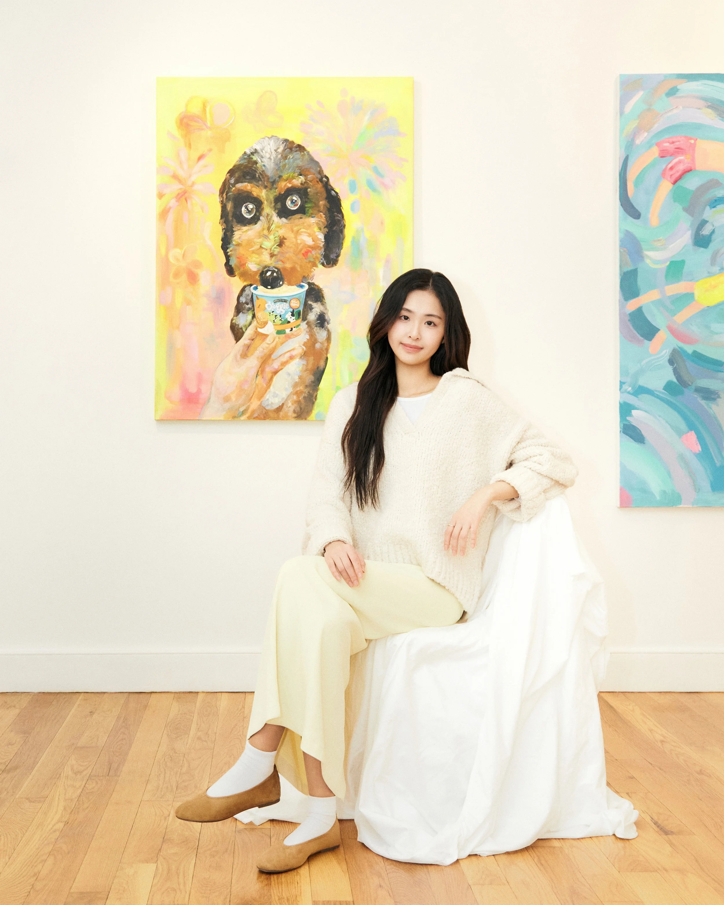 Jessica Shin is a painter who distills everyday life into gentle, luminous moments. Her work highlights the warmth found in simple rituals—a shared meal, a quiet afternoon, the presence of a loved one or a pet—inviting viewers to slow down and feel the softness within the ordinary.